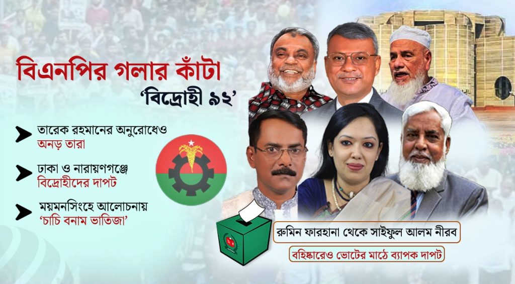 ঢাকা, নারায়ণগঞ্জ, ময়মনসিংহ, ব্রাহ্মণবাড়িয়া, সিলেট, পটুয়াখালীসহ একাধিক গুরুত্বপূর্ণ আসনে বিএনপির মূল প্রার্থীরা নিজেদের দলের বিদ্রোহীদের চাপে পড়েছেন। কয়েকটি আসনে বিদ্রোহী প্রার্থীরা সাংগঠনিক শক্তি ও ব্যক্তিগত জনপ্রিয়তার কারণে শক্ত প্রতিদ্বন্দ্বী হিসেবে বিবেচিত হচ্ছেন। এতে ধানের শীষের ভোট বিভক্ত হওয়ার শঙ্কা তৈরি হয়েছে।