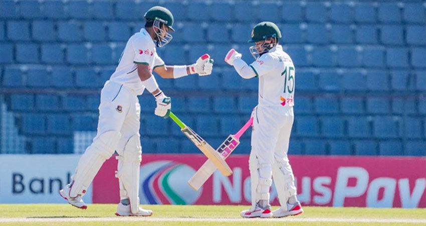 ৫২৩ রানে ৫ উইকেট হারানো বাংলাদেশের অধিনায়ক নাজমুল হোসেন শান্ত তুলে নেন ক্যারিয়ারের অষ্টম টেস্ট শতক। তবে ১০০ রান করেই থামেন ম্যাকব্রাইনের বলে। দলীয় ৫৪৫ রানে শান্তর বিদায়ের পর ৫৬১ রানে ১৭ করে আউট হন মিরাজও হাম্প্রেসকে ক্যাচ দিয়ে তার বলেই। চা-বিরতিতে যায় স্বাগতিকরা ২৮৯ রান লিড নিয়ে। দলের বোর্ডে তখন রান ৭ উইকেটে ৫৭৫।