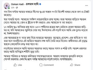 হাদির ফেসবুক স্ট্যাটাসটি হুবহু তুলে ধরা হলো :