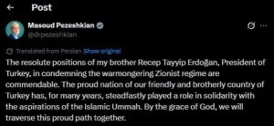 বৃহস্পতিবার (২৬ মার্চ) সামাজিক যোগাযোগমাধ্যম এক্সে দেওয়া এক পোস্টে পেজেশকিয়ান এরদোয়ানকে ‘আমার ভাই’ সম্বোধন করে লেখেন, যুদ্ধপ্রিয় জায়োনিস্ট শাসনের বিরুদ্ধে এরদোয়ানের দৃঢ় অবস্থান অত্যন্ত প্রশংসনীয়। তিনি বলেন, তুরস্কের জনগণ দীর্ঘদিন ধরে ইসলামী উম্মাহর আকাঙ্ক্ষার সঙ্গে সংহতি প্রকাশ করে আসছে এবং ভবিষ্যতেও দুই দেশ একসঙ্গে এই পথ অতিক্রম করবে।