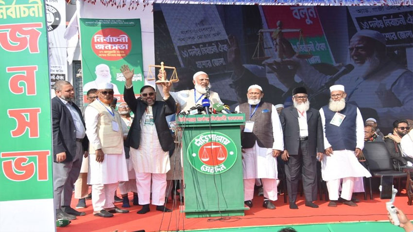 জামায়াত আমির বলেন, ‘আমাদের প্রতীক দাঁড়িপাল্লা, পাল্লার মাপে কোনো কম বেশি করবো না, যার যা প্রাপ্য অধিকার তা বুঝিয়ে দেবো।’