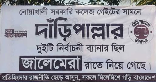নোয়াখালী সরকারি কলেজ গেট থেকে বাংলাদেশ জামায়াতে ইসলামীর একটি নির্বাচনী ব্যানার রাতের আঁধারে খুলে ফেলার অভিযোগ উঠেছে। সংগঠনটির দাবি, পরিকল্পিতভাবে ব্যানারটি অপসারণ করা হয়েছে। তবে এ ঘটনার প্রতিবাদে কলেজ গেট এলাকায় নতুন করে আরেকটি ব্যানার টাঙিয়েছে জামায়াত।