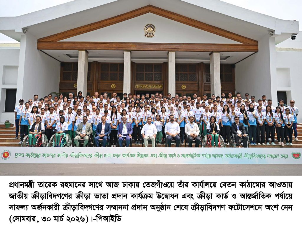 ক্রীড়াকে পেশা ও টেকসই জীবিকার মাধ্যম হিসেবে গড়ে তোলার লক্ষ্যে জাতীয় ক্রীড়াবিদদের জন্য বেতন কাঠামোর আওতায় ক্রীড়া ভাতা প্রদান কার্যক্রম উদ্বোধন করেছে সরকার। সোমবার (৩০ মার্চ) রাজধানীর প্রধানমন্ত্রীর কার্যালয়ের শাপলা হলে আয়োজিত এক অনুষ্ঠানে প্রধান অতিথি হিসেবে উপস্থিত থেকে এ কর্মসূচির উদ্বোধন করেন প্রধানমন্ত্রী তারেক রহমান।