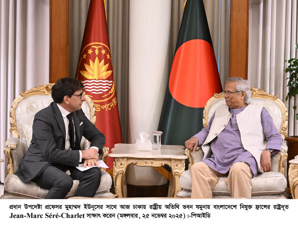 মঙ্গলবার (২৫ নভেম্বর) বিকেলে যমুনা স্টেট গেস্ট হাউসে নবনিযুক্ত ফরাসি রাষ্ট্রদূত জাঁ-মার্ক সের-শারলে সৌজন্য সাক্ষাৎ করতে গেলে প্রফেসর ইউনুস এ কথা বলেন। তিনি অন্তর্বর্তী সরকারের সংস্কার কার্যক্রম ও নির্বাচন প্রস্তুতি সম্পর্কে রাষ্ট্রদূতকে বিস্তারিত অবহিত করেন এবং গণতন্ত্র, উন্নয়ন ও আঞ্চলিক সহযোগিতায় দুই দেশের অভিন্ন স্বার্থের কথা তুলে ধরেন।