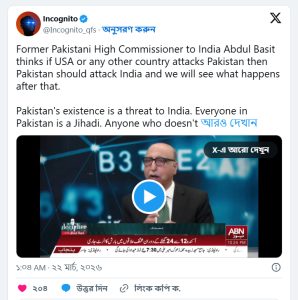 ভারতে নিযুক্ত পাকিস্তানের সাবেক হাইকমিশনার আব্দুল বাসিতের এক মন্তব্য ঘিরে দক্ষিণ এশিয়ার কূটনৈতিক অঙ্গনে নতুন করে আলোচনা শুরু হয়েছে। একটি কাল্পনিক যুদ্ধ পরিস্থিতি নিয়ে কথা বলতে গিয়ে তিনি ইঙ্গিত দেন, পাকিস্তান যদি কোনো বিদেশি শক্তির হামলার শিকার হয়, তাহলে প্রতিক্রিয়ায় ভারতের গুরুত্বপূর্ণ শহরগুলো লক্ষ্যবস্তু হতে পারে।
